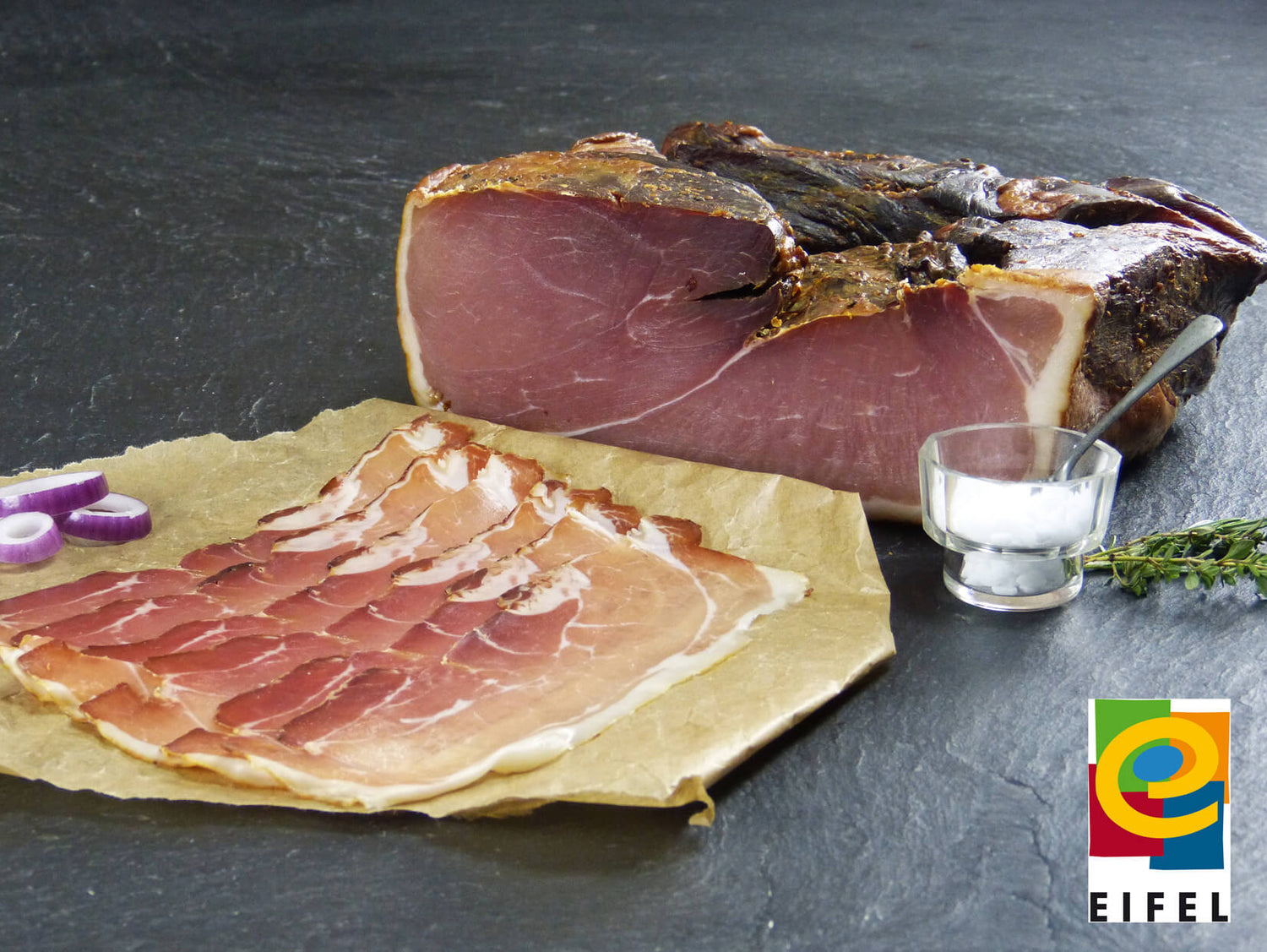 Unser EIFEL Bauernschinken ist ein wahrer Klassiker mit jahrzehntelanger Tradition. Dieser delikate Rohschinken wird aus sorgfältig ausgewählten Schweinekeulen der Regionalmarke EIFEL hergestellt und ist ein Highlight unserer Hünten-Schinkenlinie.
