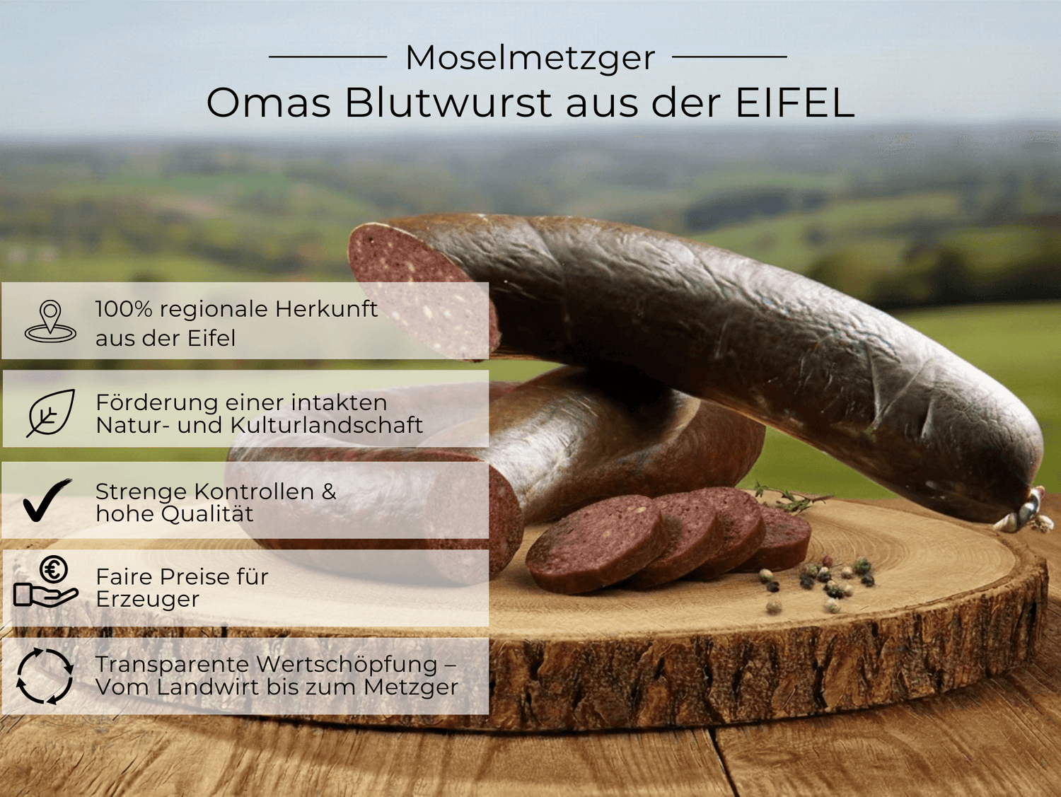 Egal ob als Blutwurst, Schwarzwurst, Hausmacher Blutwurst oder Blunzn - Omas Blutwurst vom Moselmetzger schmeckt!