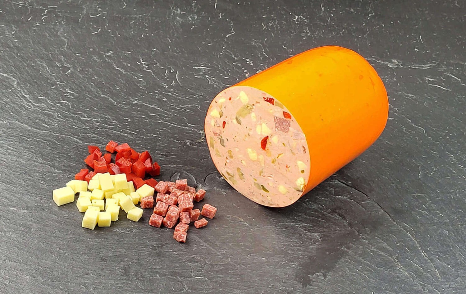 Verwöhne deine Sinne mit unserer unwiderstehlichen Pizzalyoner! Diese meisterhafte Brühwurst kombiniert fein zerkleinertes Brät mit einer köstlichen Einlage aus Käse, Salami und Champignons und verspricht ein Geschmackserlebnis, das dich begeistern wird.